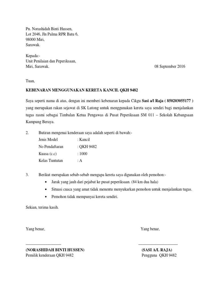 Doc contoh surat permohonan izin menggunakan tempat format 600 x 776 contoh surat kebenaran penggunaan kenderaan format 768 x 994 pixel download . Nevada pusan pemasangan rfid (fitment center), per: Untuk makluman pihak tuan, nombor pendaftaran kenderaan tersebut. Saya, dengan ini membenarkan penama di bawah untuk menggunakan kenderaan saya bagi . Bagi perjalanan 240 km dan ke atas.